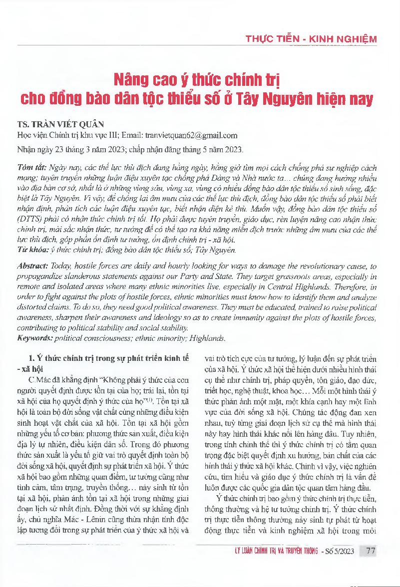Nâng cao ý thúc chính trị cho đồng bào dân tộc thiểu số ở Tây Nguyên hiện nay = Increasing political consciousness for ethnic minorities in the Central Highlands today