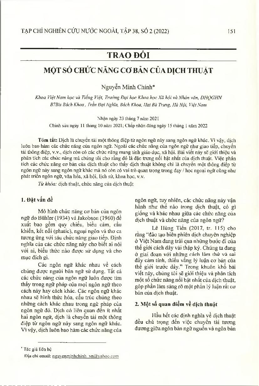 Một số chức năng cơ bản của dịch thuật = Some Basic Functions of Translation