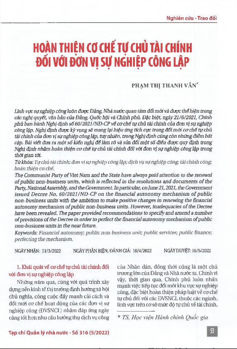 Hoàn thiện cơ chế tự chủ tài chính đối với đơn vị sự nghiệp công lập = Perfecting the financial autonomy mechanism of public non-business units