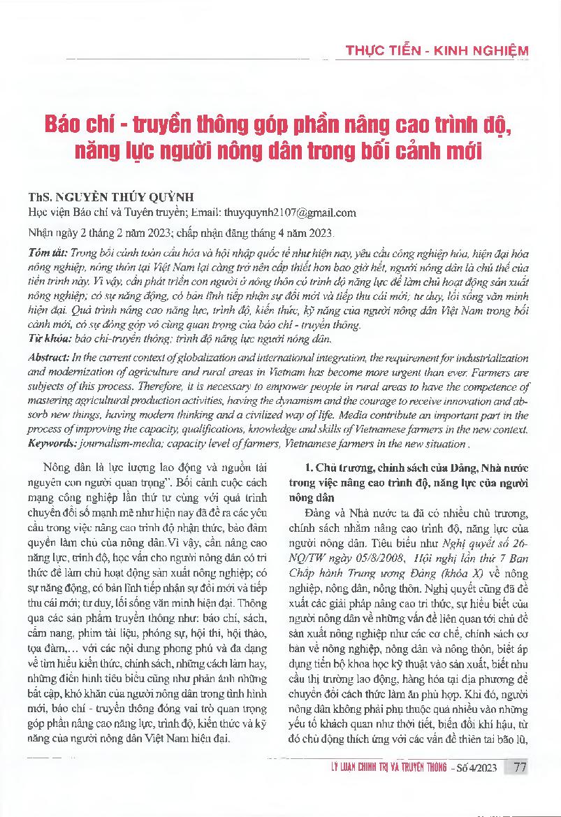 Báo chí - truyền thông góp phần nâng cao trình độ, năng lực người nông dân trong bối cảnh mới = Journalism - media contributes to intellectualization