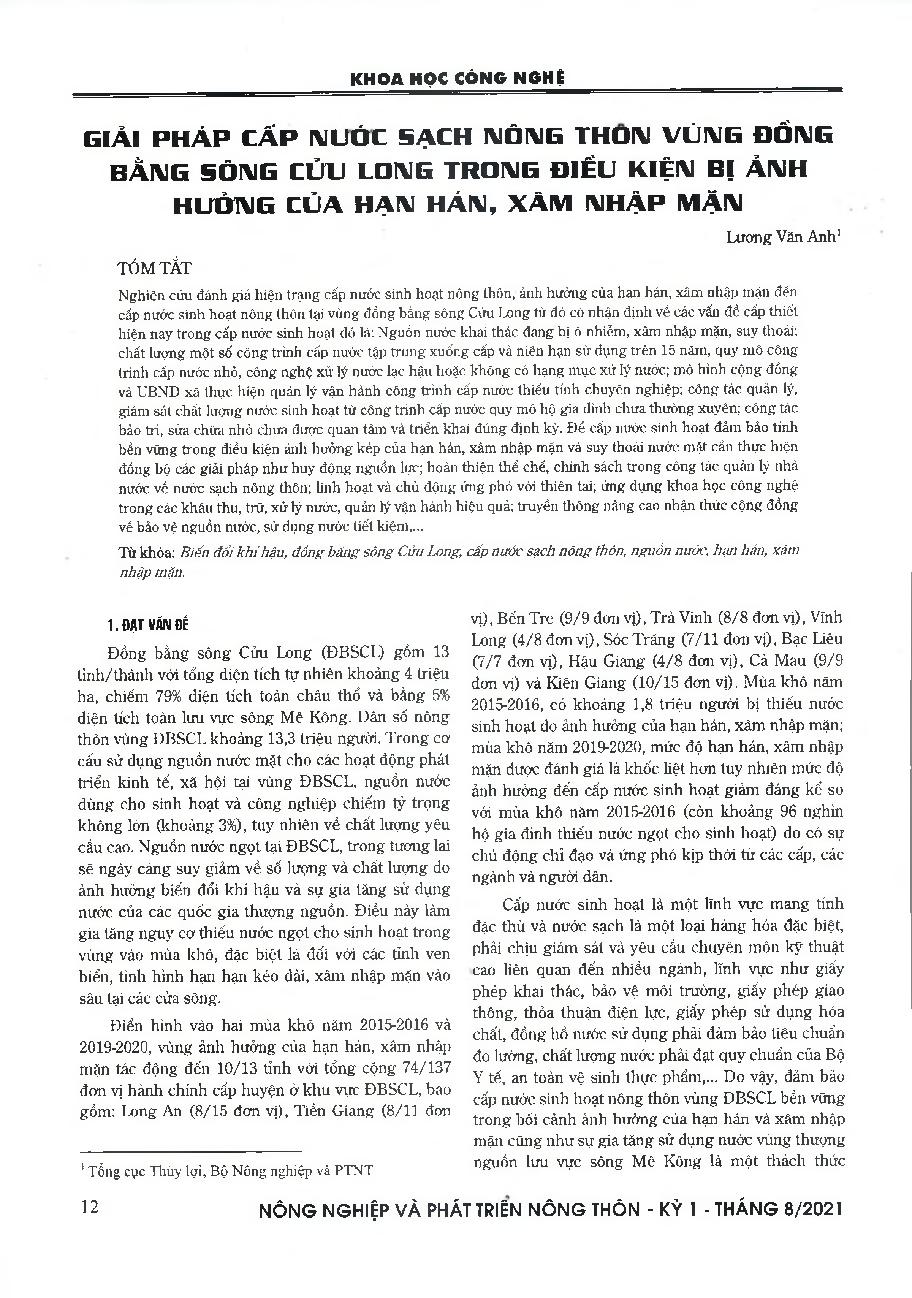Giải pháp cấp nước sạch nông thôn vùng đồng bằng sông Cửu Long trong điều kiện bị ảnh hưởng của hạn hán, xâm nhập mặn