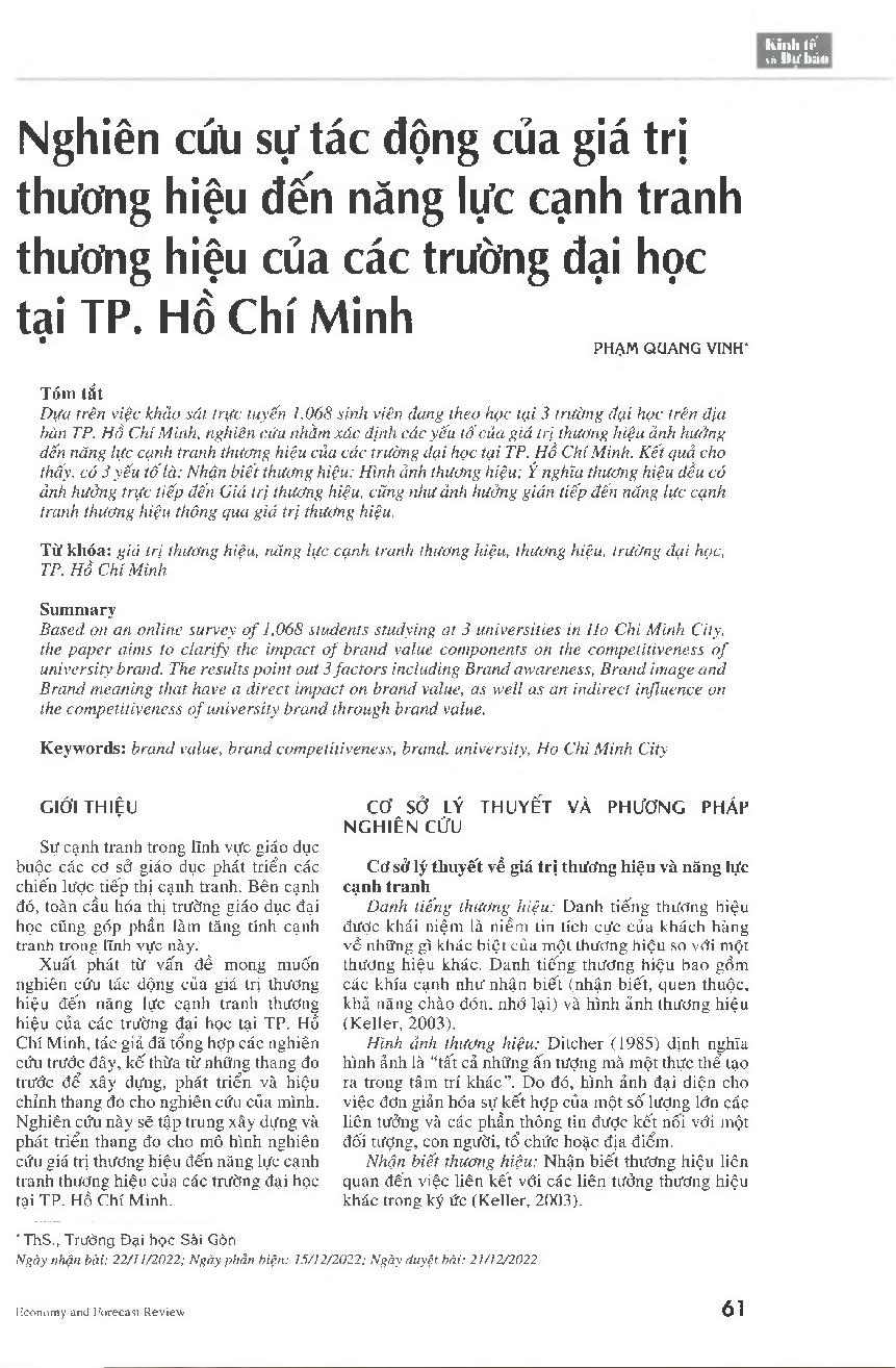 Nghiên cứu sự tác động của giá trị thương hiệu đến năng lực cạnh tranh thương hiệu của các trường đại học tại TP. Hồ Chí Minh = A study on the impact of brand value on competitiveness of university brands in Ho Chi Minh City