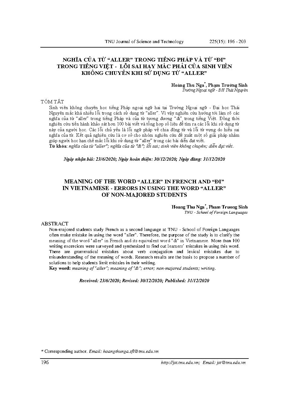 Nghĩa của từ “aller” trong tiếng Pháp và từ “đi” trong tiếng Việt - Lỗi sai hay mắc phải của sinh viên không chuyên khi sử dụng từ “aller” = Meaning of the word “Aller” in french and “Đi” in Vietnamese - errors in using the word “Aller” of non-majored students