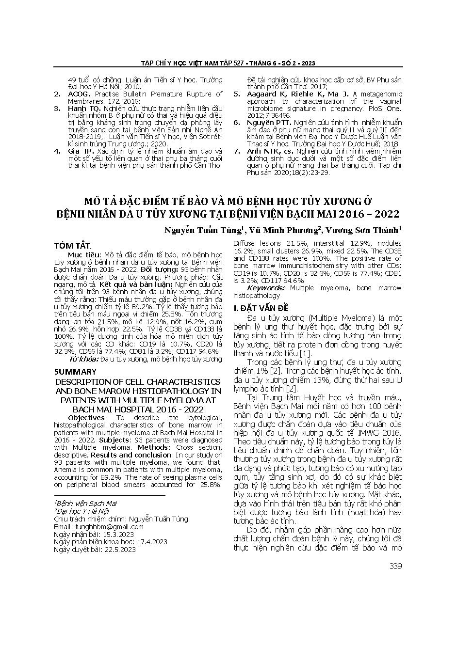 Mô tả đặc điểm tế bào và mô bệnh học tủy xương ở bệnh nhân đa u tủy xương tại Bệnh viện Bạch Mai 2016 – 2022 = Description of cell characteristics and bone marrow histopathology in patients with multiple myeloma at Bach Mai hospital 2016 - 2022