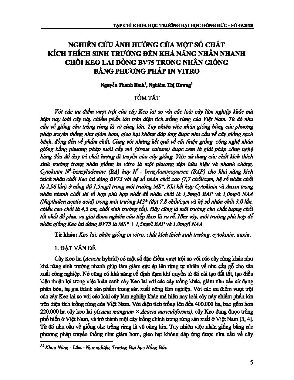 NGHIÊN CỨU ẢNH HƯỞNG CỦA MỘT SỐ CHẤT KÍCH THÍCH SINH TRƯỞNG ĐẾN KHẢ NĂNG NHÂN NHANH CHỒI KEO LAI DÒNG BV75 TRONG NHÂN GIỐNG BẰNG PHƯƠNG PHÁP IN VITRO = THE STUDY OF THE AFFECTION OF PLANT GROWTH REGULATORS ON SHOOT MULTIPLICATION OF ACACIA HYBRID BV75 SUBSPECIES BY IN VITRO METHOD