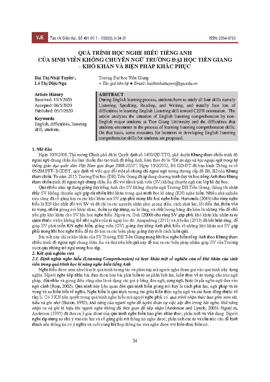 Quá trình học nghe hiểu tiếng anh của sinh viên không chuyên ngữ trường Đại học Tiền Giang - khó khăn và biện pháp khắc phục = The process of learning, listening and understanding English of non-professional students at Tien Giang University - difficulties and solutions