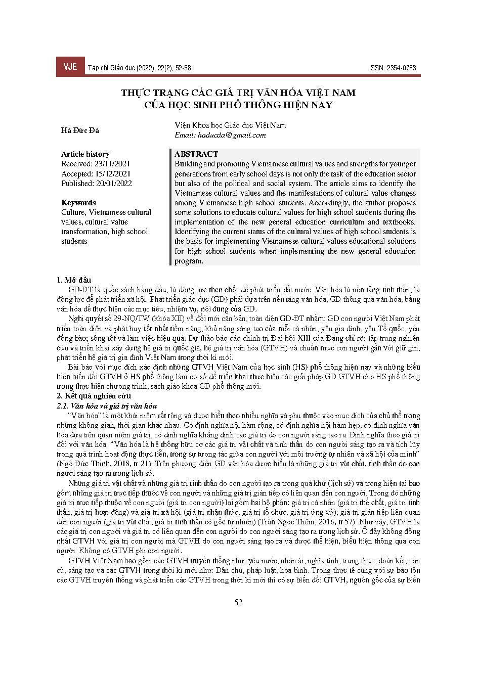 Thực trạng các giá trị văn hóa Việt Nam của học sinh phổ thông hiện nay = Current status of Vietnamese cultural values of high school students