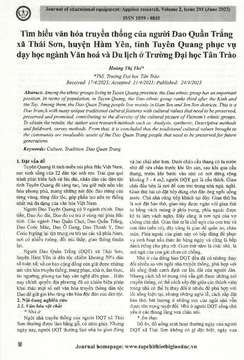 Tìm hiểu văn hóa truyền thống của người Dao Quần Trắng xã Thái Sơn, huyện Hàm Yên, tỉnh Tuyên Quang phục vụ dạy học ngành Văn hoá và Du lịch ở Trường Đại học Tân Trào = Research on the traditional culture of the Dao Quan Trang people in Thai Son commune,