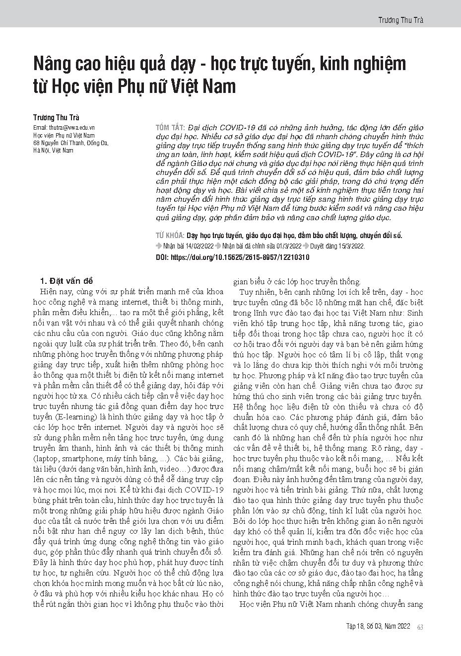 Nâng cao hiệu quả dạy - học trực tuyến, kinh nghiệm từ Học viện Phụ nữ Việt Nam = Improving the effectiveness of online learning and teaching: experience from vietnam women’s academy
