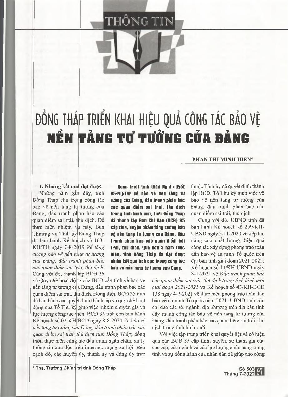 Đồng Tháp triển khai hiệu quả công tác bảo vệ nền tảng tư tưởng của Đảng = Dong Thap effectively implemented the work of protecting the ideological foundation of the Party