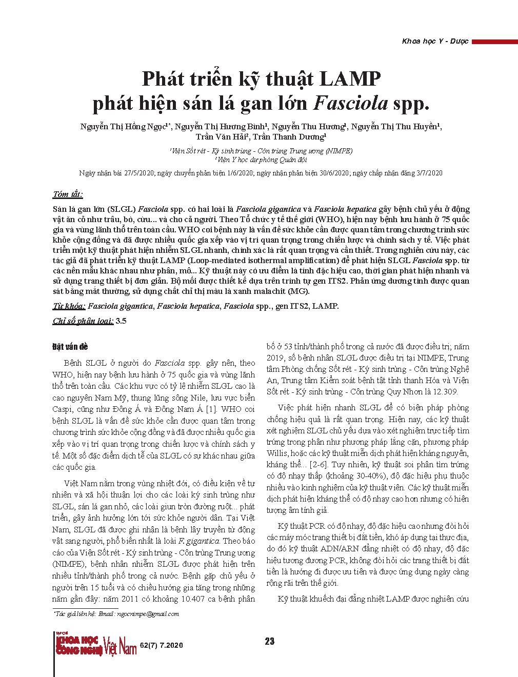 Phát triển kỹ thuật LAMP phát hiện sán lá gan lớn Fasciola spp. = Developement of a LAMP (Loop-mediated isothermal amplication) assay for detection of Fasciola spp.