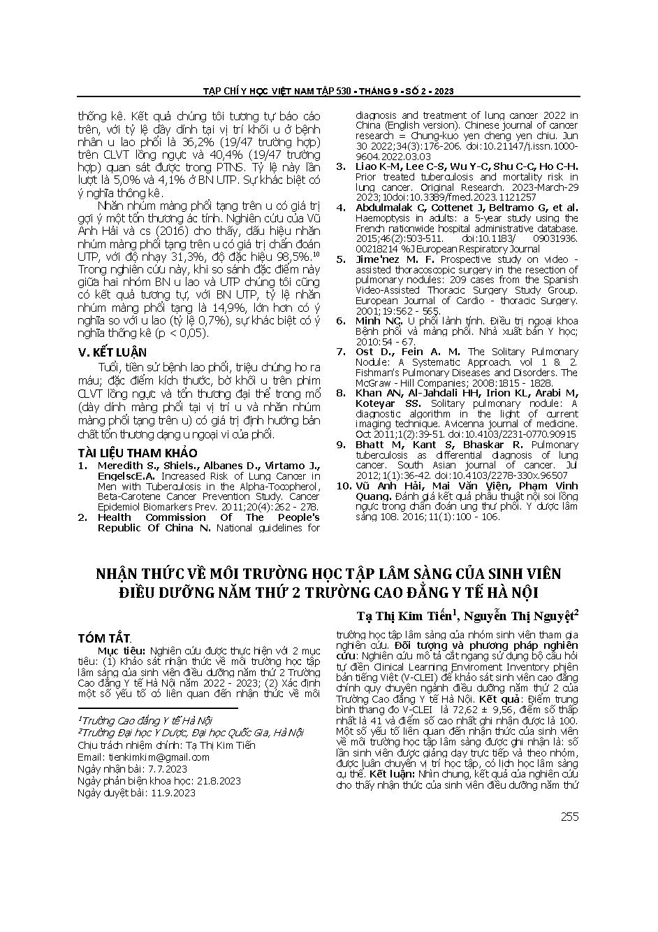 Nhận thức về môi trường học tập lâm sàng của sinh viên điều dưỡng năm thứ 2 trường cao đẳng y tế Hà Nội = Perception about the clinical learning environment of second-year nursing students at hanoi medical college