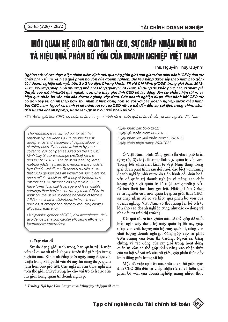 Mối quan hệ giữa giới tính CEO, sự chấp nhận rủi ro và hiệu quả phân bổ vốn của doanh nghiệp Việt Nam = Relationship between CEO’s gender, risk acceptance and efficiency of capital allocation of Vietnam’s businesses