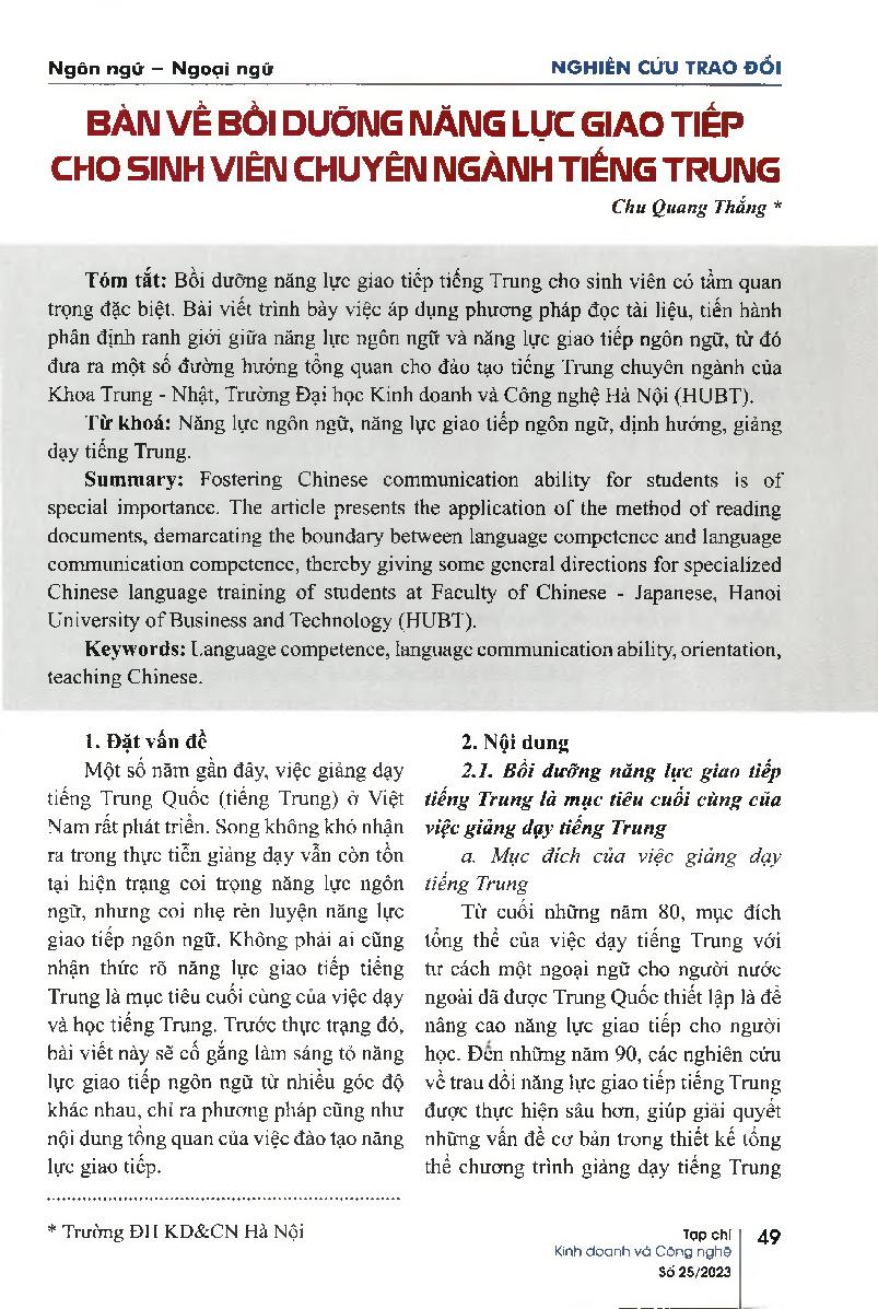 Bàn về bồi dưỡng năng lực giao tiếp cho sinh viên chuyên ngành tiếng Trung = Discussing on communication ability training for students specializing in Chinese language