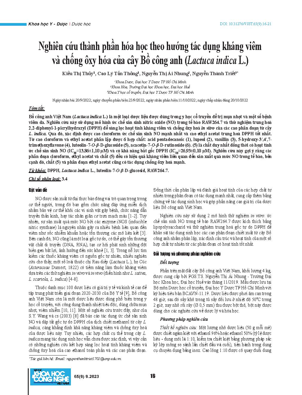 Nghiên cứu thành phần hóa học theo hướng tác dụng kháng viêm và chống ôxy hóa của cây Bồ công anh (Lactuca indica L.) = Anti-inflammatory and anti-oxidant activity-guided investigation of phytoconstituents from Lactuca indica L.