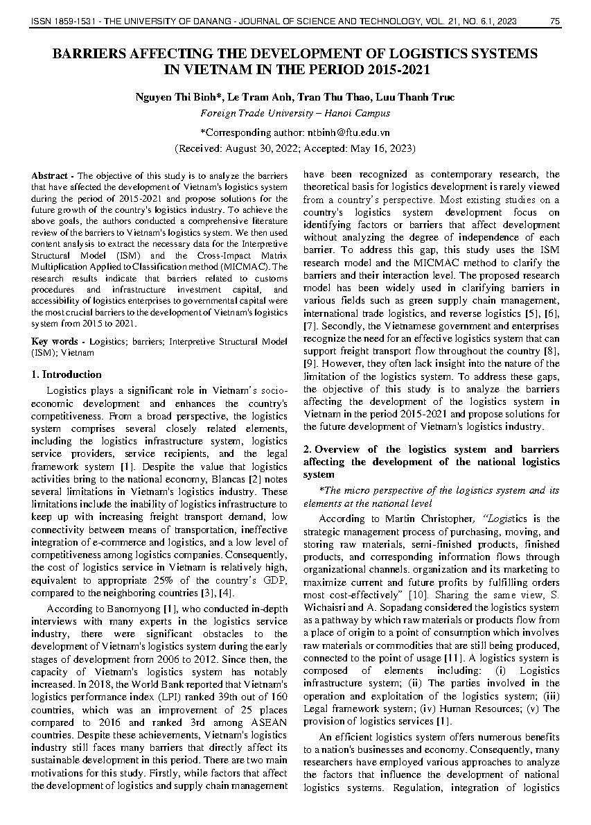 Những rào cản ảnh hưởng đến sự phát triển của hệ thống logistics Việt Nam giai đoạn 2015-2021 = Barriers affecting the development of logistics systems in vietnam in the period 2015-2021