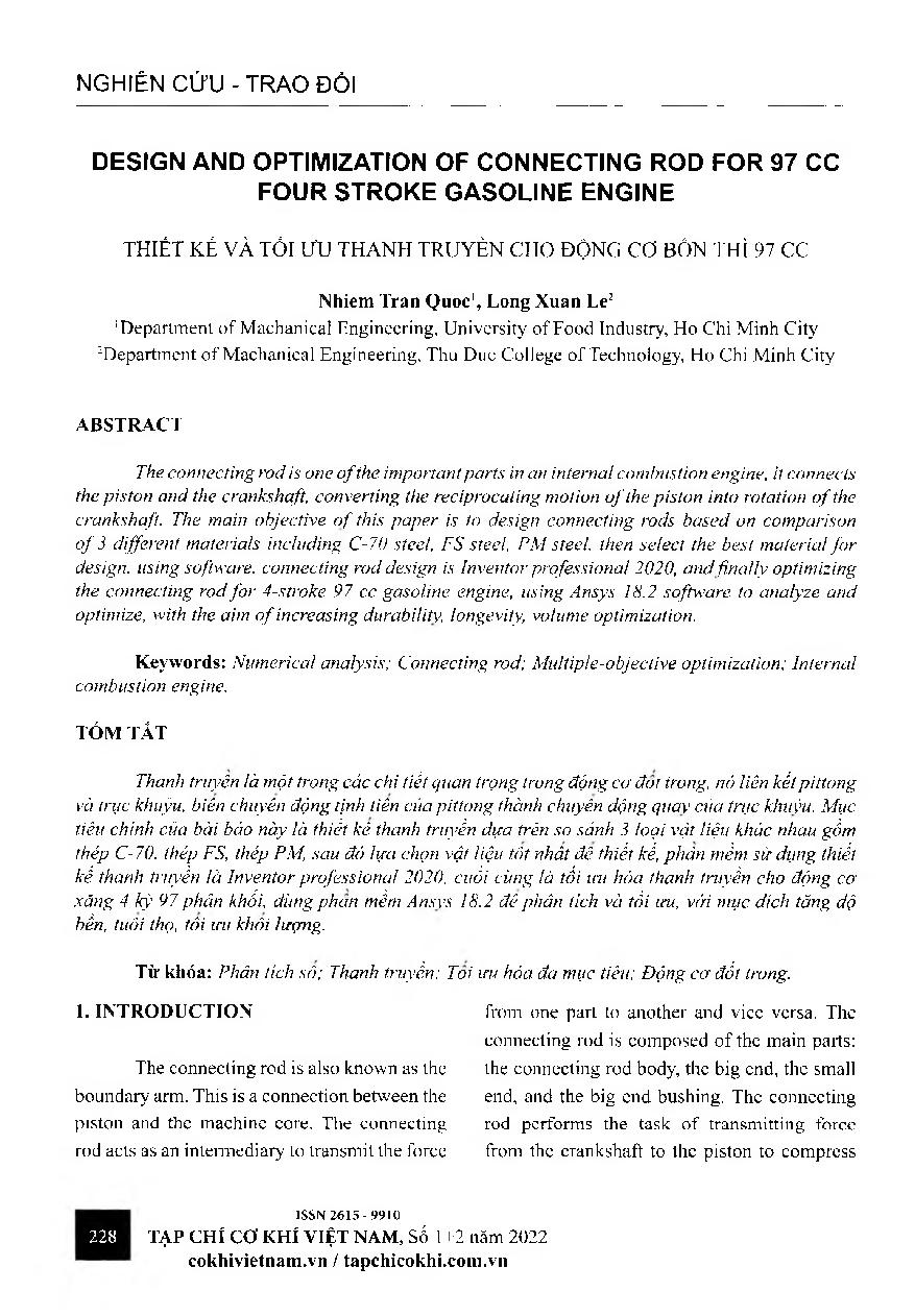 Thiết kế và tối ưu thanh truyền cho động cơ bốn thì 97 cc = Design and optimization of Connecting Rod for 97 cc four stroke gasoline engine