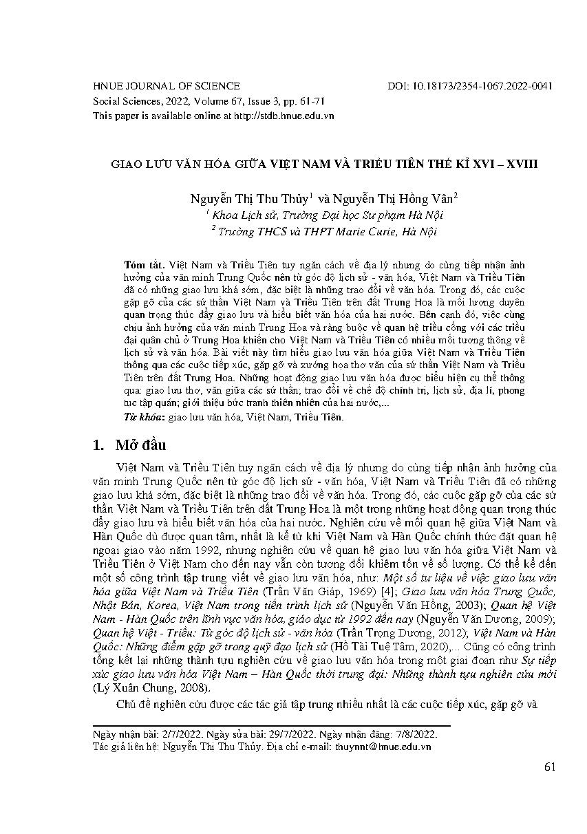 Giao lưu văn hóa giữa Việt Nam và Triều Tiên thế kỉ xvi – xviii = Cultural exchange between Vietnam and Korea in the 16th – 18th centuries