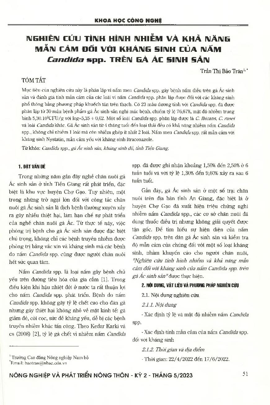 Nghiên cứu tình hình nhiễm và khả năng mẫn cảm đối với kháng sinh của nấm Candida spp. trên gà Ác sinh sản = The situation and sufference to antibiotics of Candida spp. on Ac laying hens