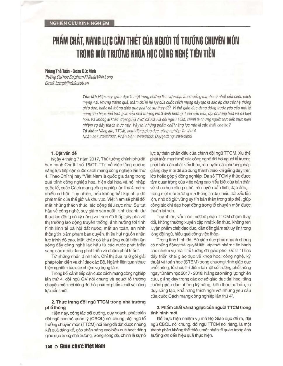 Phẩm chất, năng lực cần thiết của người tổ trưởng chuyên môn trong môi trường khoa học công nghệ tiên tiến