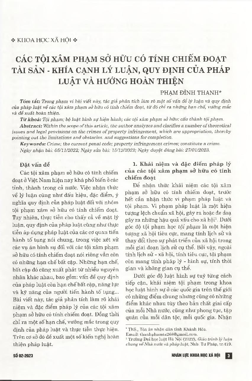Các tội xâm phạm sở hữu có tính chiếm đoạt tài sản - khía cạnh lý luận, quy định của pháp luật và hướng hoàn thiện = Crimes of infringing on property which are property appropriation - Theoretical aspect, legal provisions and directions to complete