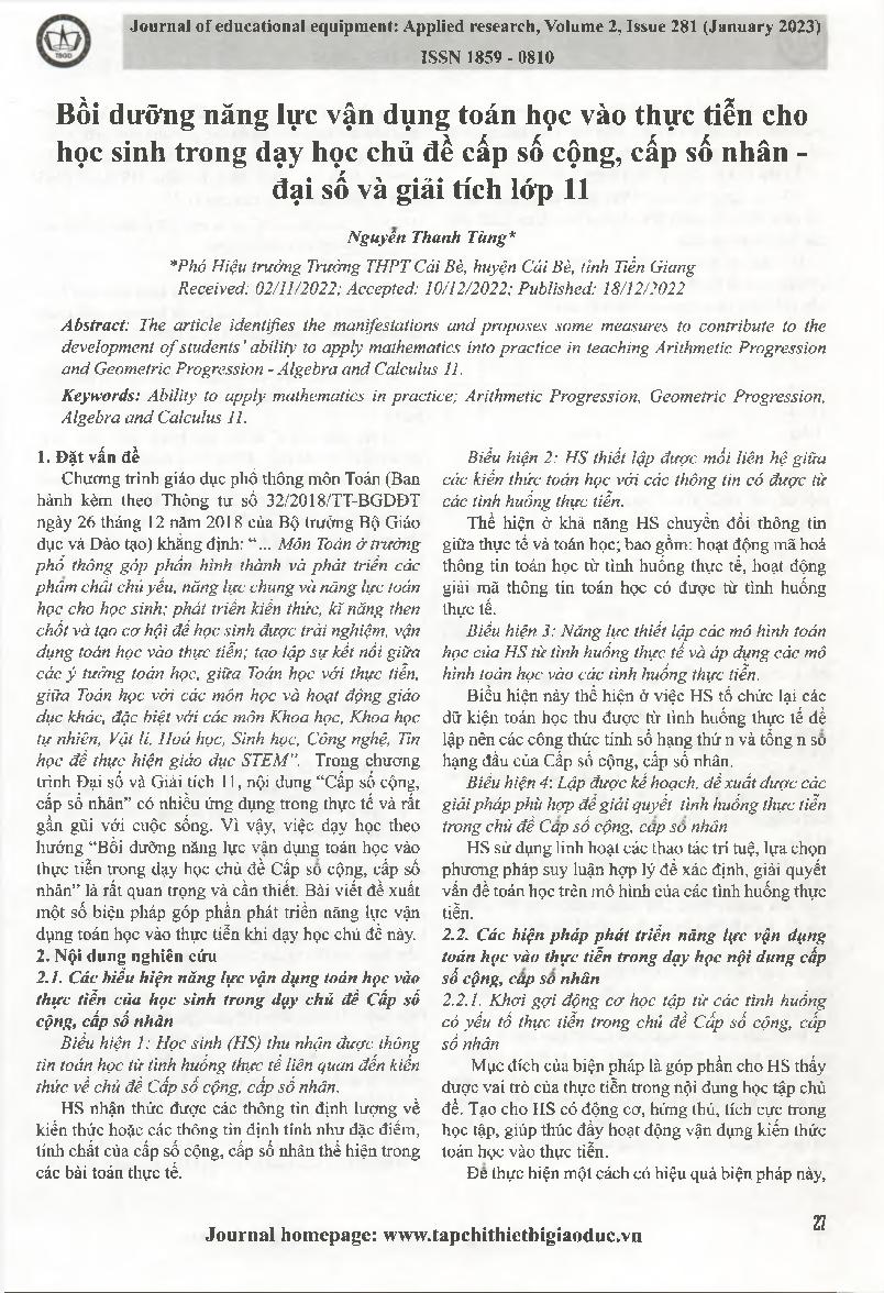 Bồi dưỡng năng lực vận dụng toán học vào thực tiễn cho học sinh trong dạy học chủ đề cấp số cộng, cấp số nhân - đại số và giải tích lớp 11 = Fostering the ability to apply mathematics in practice for students in teaching the topic of addition, multiplicat