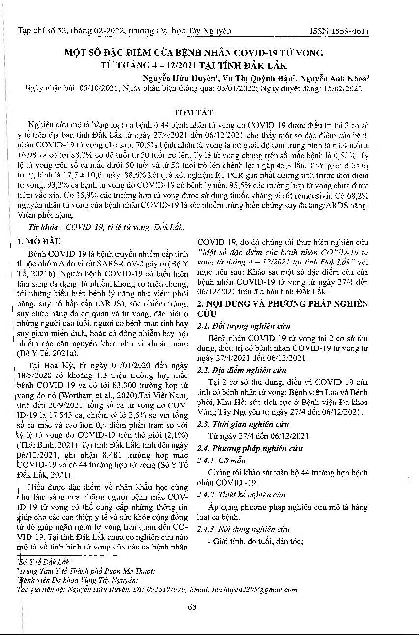 Một số đặc điểm của bệnh nhân COVID-19 tử vong từ tháng 4 – 12/2021 tại tỉnh Đắk Lắk = Some characteristics of deceased COVID-19 patients from April to December 2021 in Dak Lak province