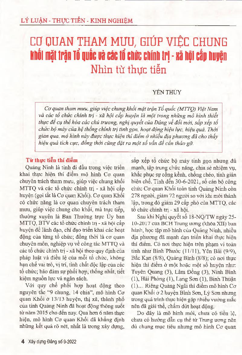 Cơ quan tham mưu, giúp việc chung khối mặt trận Tổ quốc và các tổ chức chính trị - xã hội cấp huyện - Nhìn từ thực tiễn