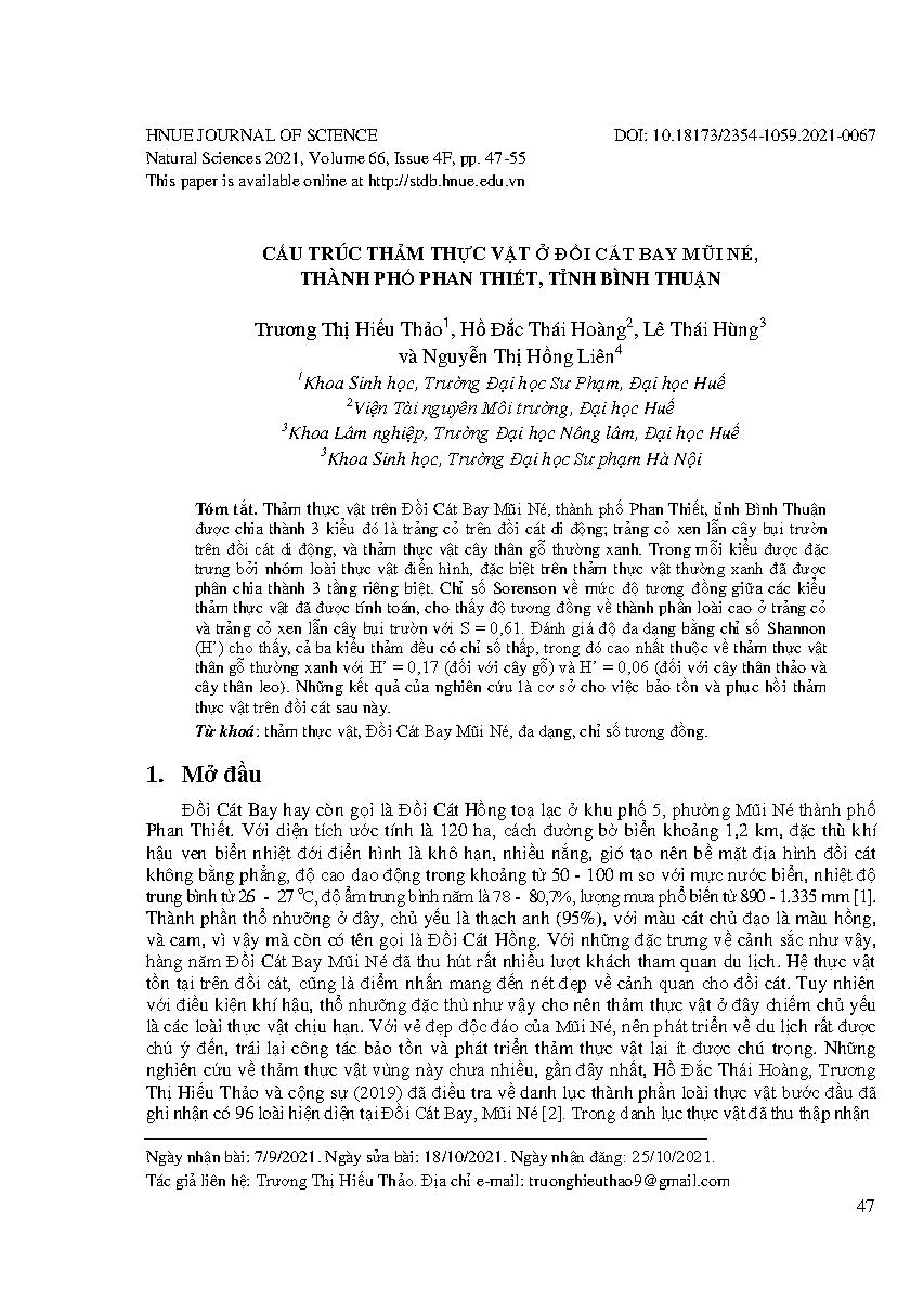 Cấu trúc thảm thực vật ở đồi cát bay Mũi Né, thành phố Phan Thiết, tỉnh Bình Thuận = Vegetable structure in the Bay Sand Dune of Mui Ne, Phan Thiet city, Binh Thuan province
