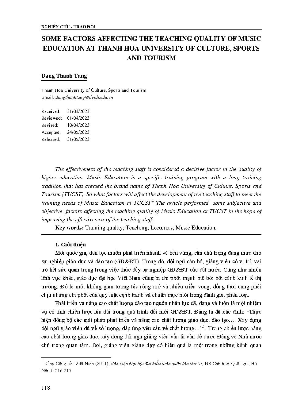 Một số yếu tố tác động đến chất lượng giảng dạy của giảng viên ngành sư phạm âm nhạc tại trường Đại học Văn hóa, Thể thao và Du lịch Thanh Hóa = Some factors affecting the teaching quality of music education at Thanh Hoa University of Culture, Sports and