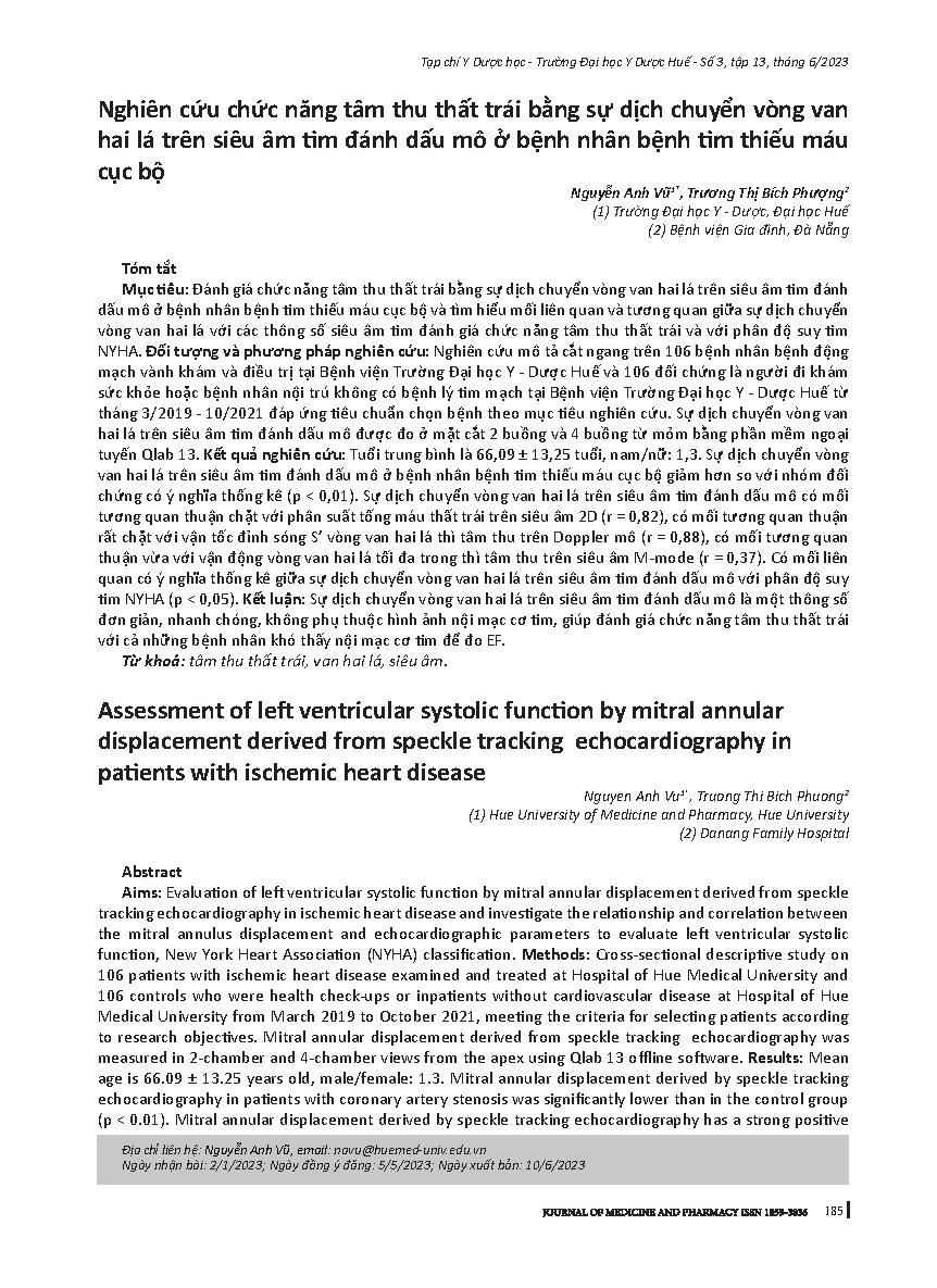 Nghiên cứu chức năng tâm thu thất trái bằng sự dịch chuyển vòng van hai lá trên siêu âm tim đánh dấu mô ở bệnh nhân bệnh tim thiếu máu cục bộ = Assessment of left ventricular systolic function by mitral annular displacement derived from speckle tracking e