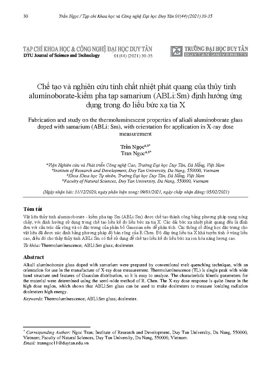 Chế tạo và nghiên cứu tính chất nhiệt phát quang của thủy tinh aluminoborate-kiềm pha tạp samarium (ABLi:Sm) định hướng ứng dụng trong đo liều bức xạ tia X = Fabrication and study on the thermoluminescent properties of alkali aluminoborate glass doped with samarium (ABLi: Sm), with orientation for application in X-ray dose measuremen