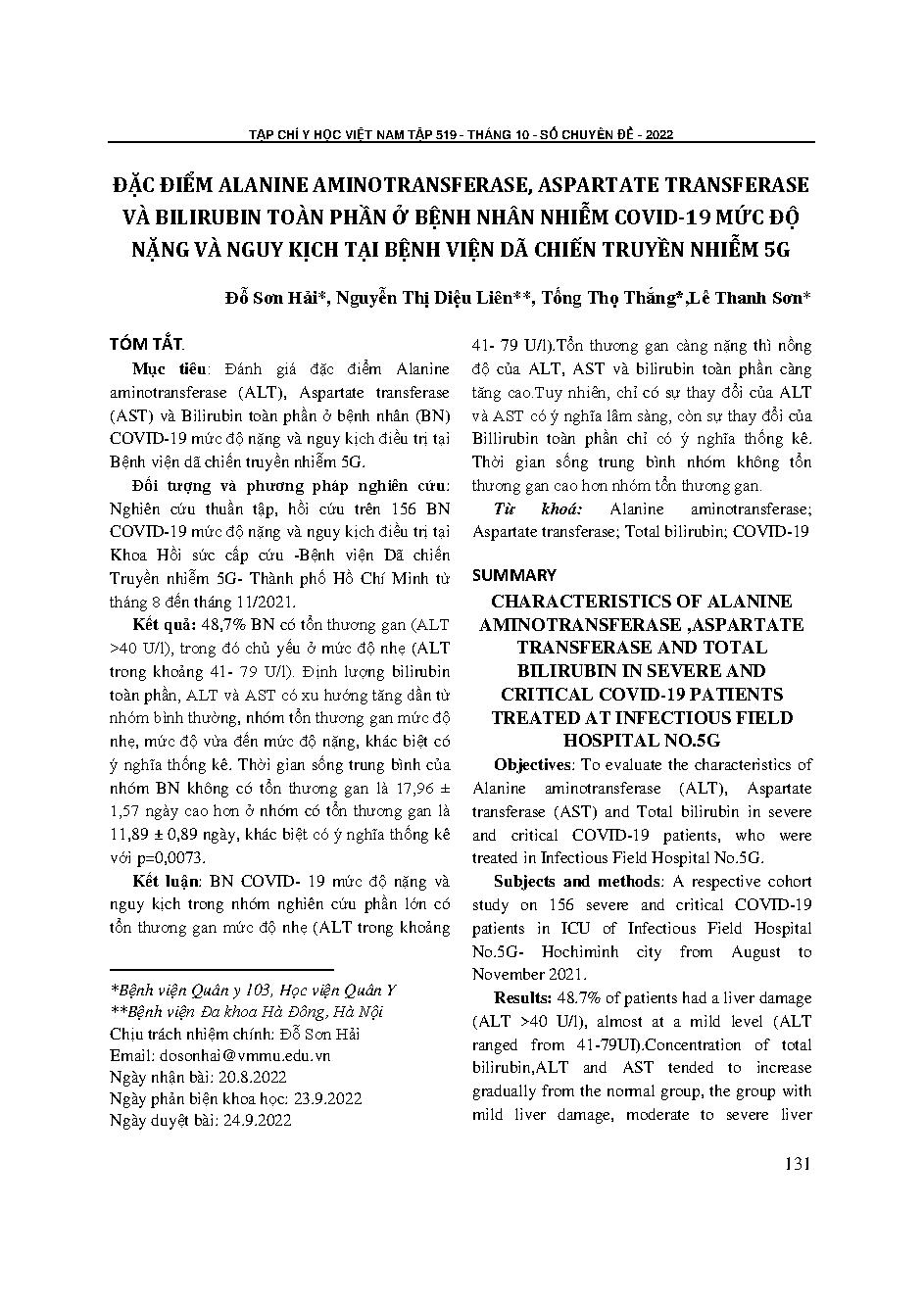Đặc điểm Alanine aminotransferase, Aspartate transferase và Bilirubin toàn phần ở bệnh nhân nhiễm Covid-19 mức độ nặng và nguy kịch tại Bệnh viện Dã chiến truyền nhiễm 5G = Characteristics of Alanine aminotransferase, Aspartate transferase and total Bil
