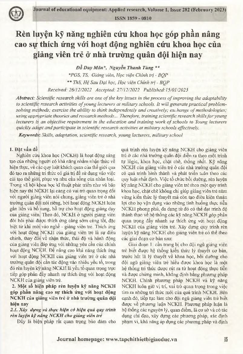 Rèn luyện kỹ năng nghiên cứu khoa học góp phần nâng cao sự thích ứng với hoạt động nghiên cứu khoa học của giảng viên trẻ ở nhà trường quân đội hiện nay = Training scientific research skills to improve the adaptability to scientific research activities of