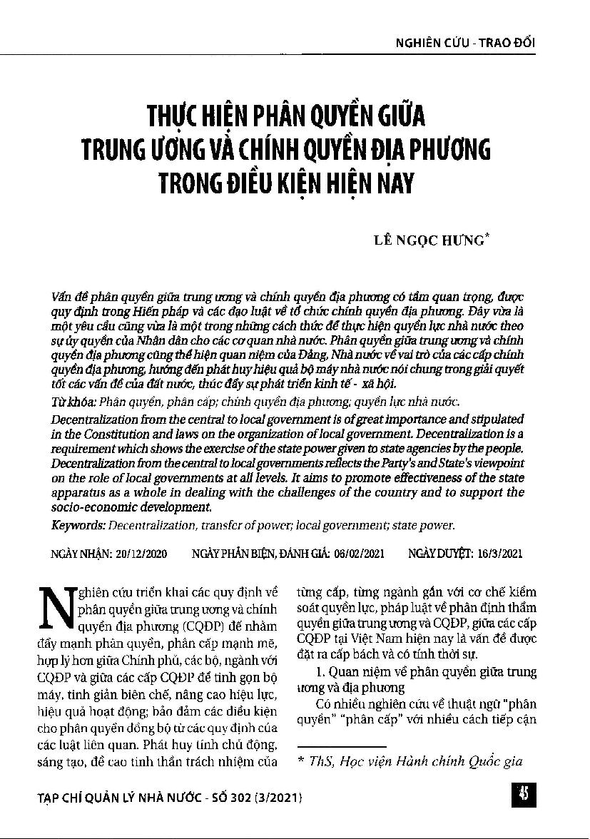 Thực hiện phân quyền giữa trung ương và chính quyền địa phương trong điều kiện hiện nay
