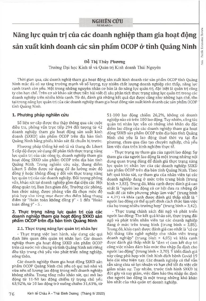 Năng lực quản trị của các doanh nghiệp tham gia hoạt động sản xuất kinh doanh các sản phẩm OCOP ở tỉnh Quảng Ninh