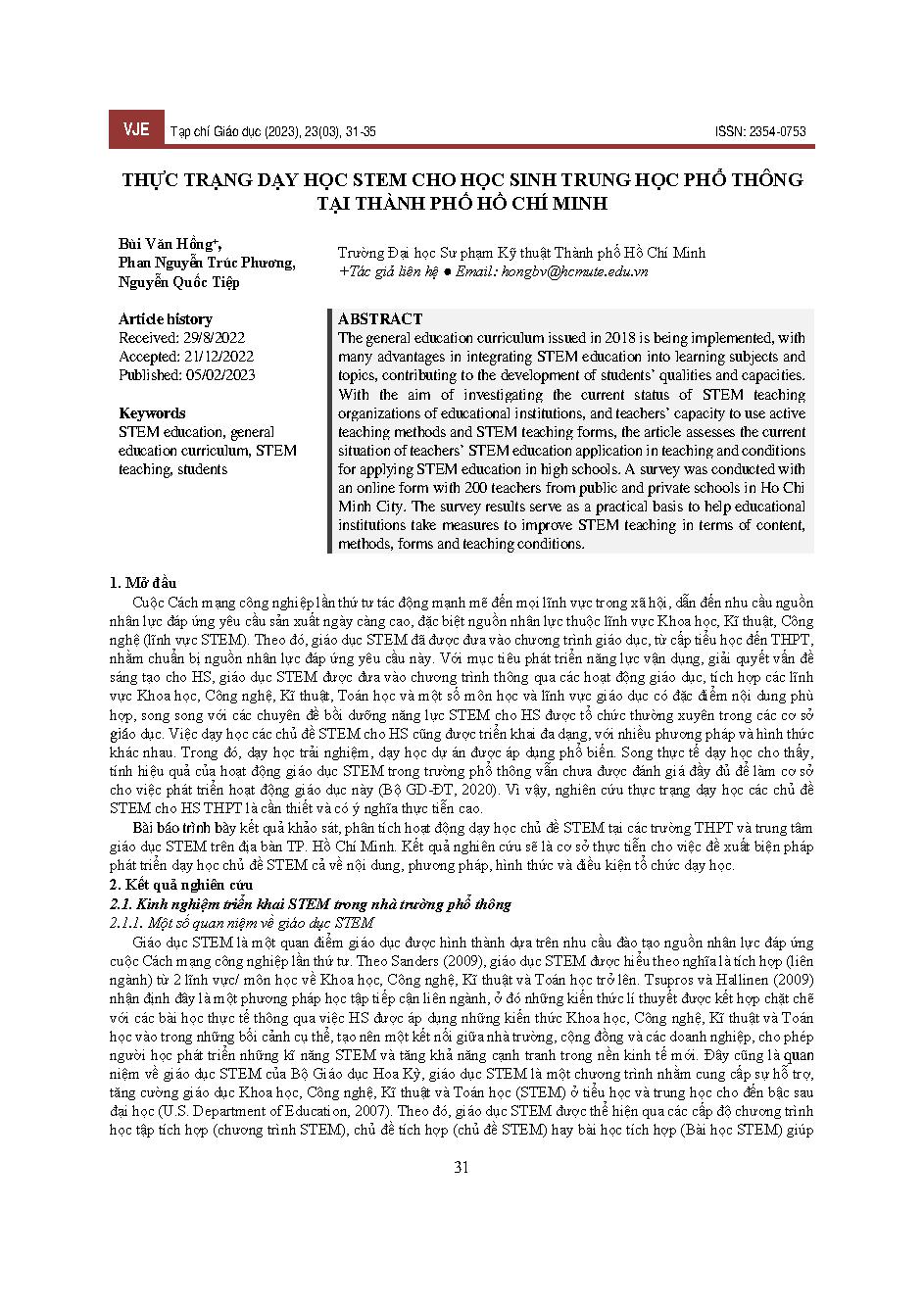 Thực trạng dạy học STEM cho học sinh trung học phổ thông tại thành phố Hồ Chí Minh = Current status of STEM teaching for high school students in Ho Chi Minh City
