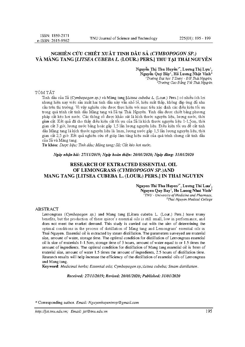 Nghiên cứu chiết xuất tinh dầu sả (Cymbopogon SP.) và màng tang [Litsea cubeba l. (lour.) Pers.] thu tại Thái Nguyên = Research of extracted essential oil of lemongrass (cymbopogon sp.) and mang tang [Litsea cubeba l. (lour.) Pers.] in Thai Nguyen