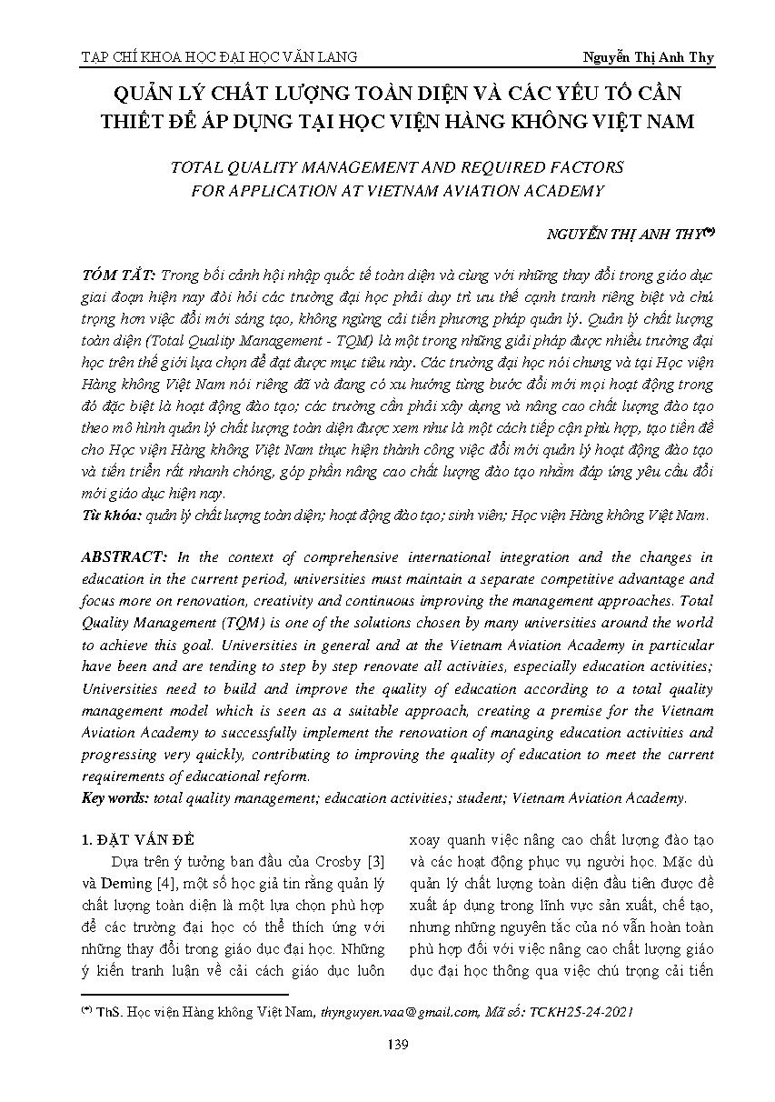 Quản lý chất lượng toàn diện và các yếu tố cần thiết để áp dụng tại Học viện Hàng không Việt Nam = Total quality management and required factors for application at Vietnam Aviation Academy
