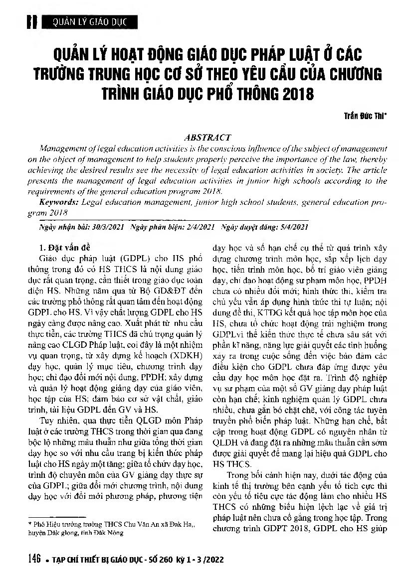 Quản lý hoạt động giáo dục pháp luật ở các trường trung học cơ sở theo yêu cầu của chương trình giáo dục phổ thông 2018 = Managing legal education activities in junior high schools according to the requirements of the general education program 2018