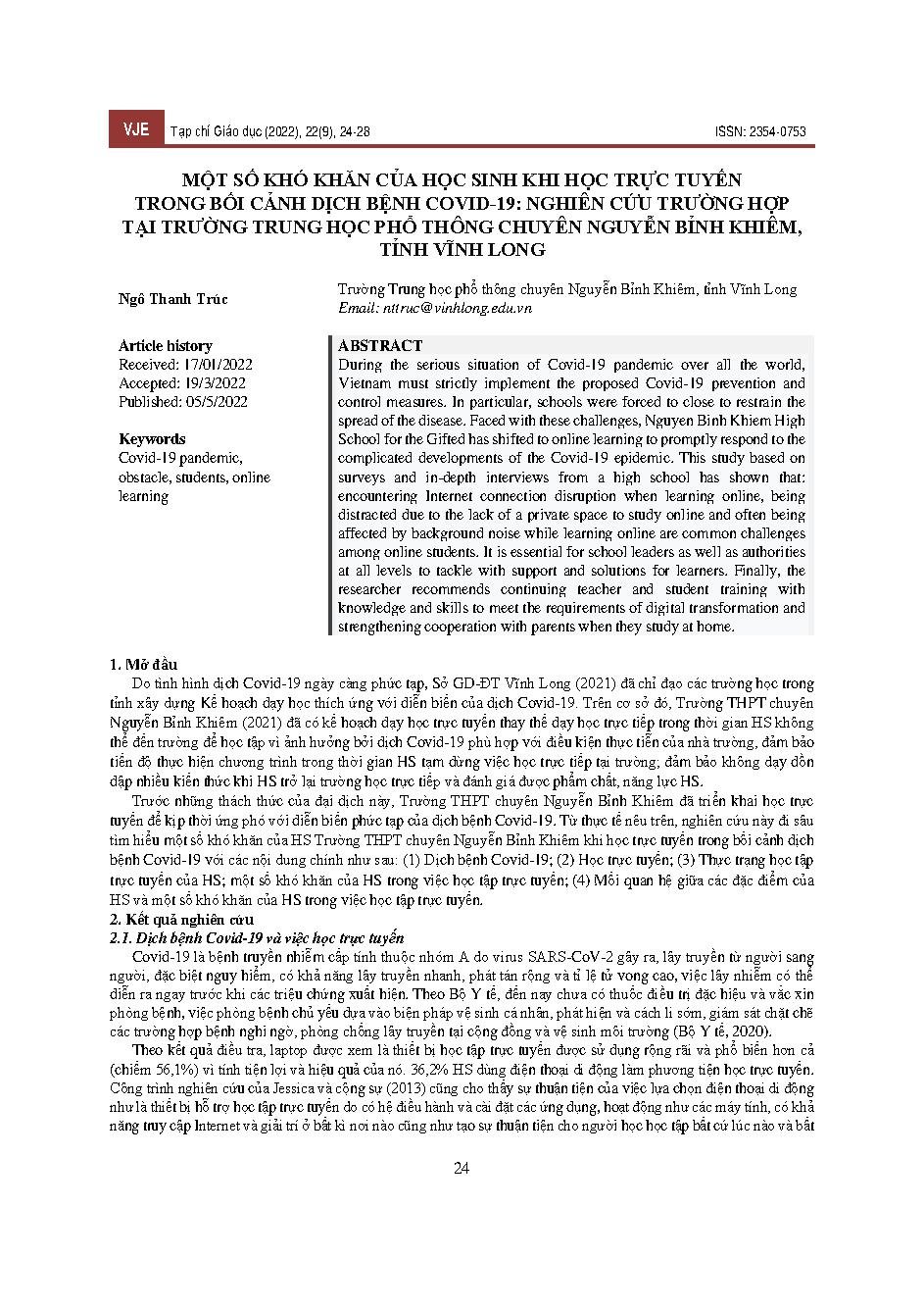 Một số khó khăn của học sinh khi học trực tuyến trong bối cảnh dịch bệnh Covid-19: nghiên cứu trường hợp tại Trường Trung học phổ thông chuyên Nguyễn Bỉnh Khiêm, tỉnh Vĩnh Long = Some difficulties of students when learning online in the context of the Cov