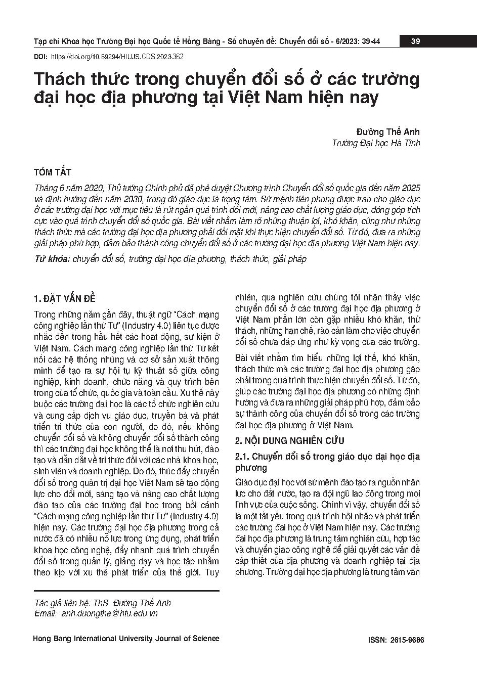 Thách thức trong chuyển đổi số ở các trường đại học địa phương tại Việt Nam hiện nay = Challenges in digital transformation of local Universities inVietnam today