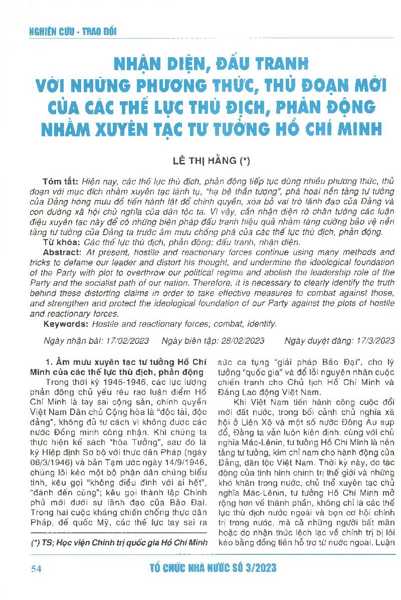 Nhận diện, đấu tranh với những phương thức, thủ đoạn mới của các thế lực thù địch, phản động nhàm xuyên tạc tư tưởng Hồ Chí Minh = Identifying and combating against new methods and tricks of hostile and reactionary forces to distort Ho Chi Minh thought
