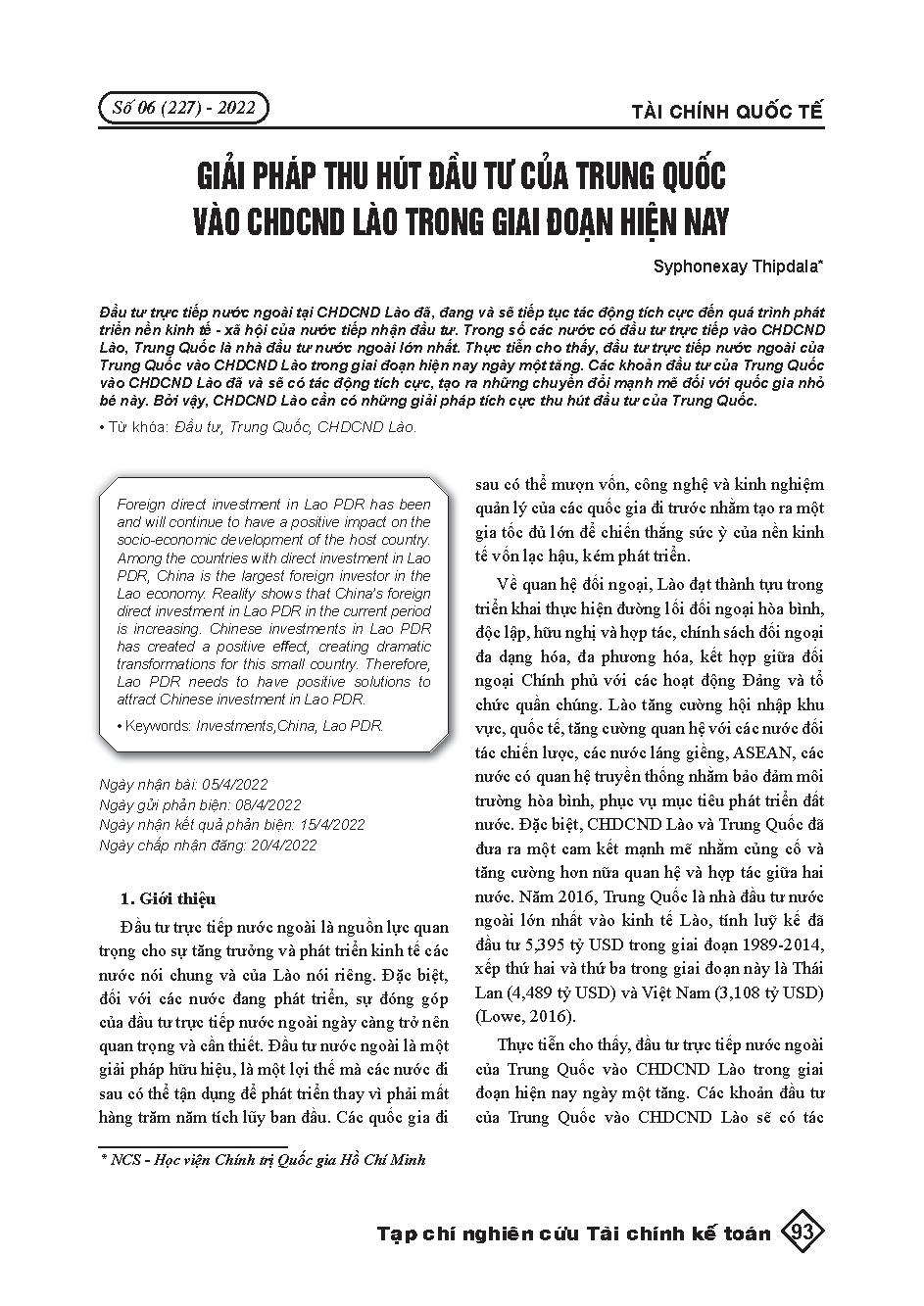 Giải pháp thu hút đầu tư của Trung Quốc vào CHDCND Lào trong giai đoạn hiện nay = Some solutions to attract Chinese investment into Lao PDR in the current period