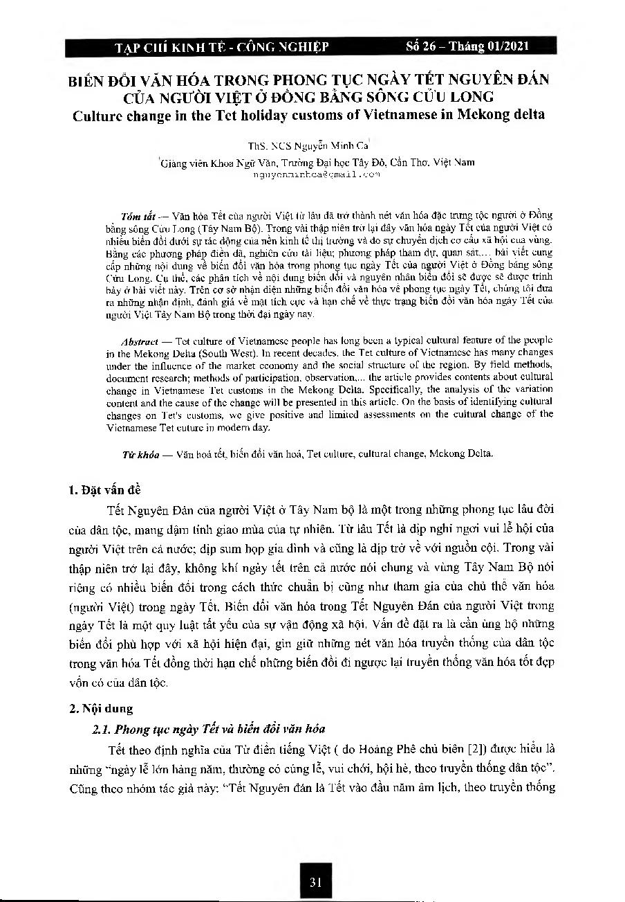 Biến đổi văn hóa trong phong tục ngày Tết Nguyên đán của người Việt ở Đồng bằng sông Cửu Long = Culture change in the Tet holiday customs of Vietnamese in Mekong delta