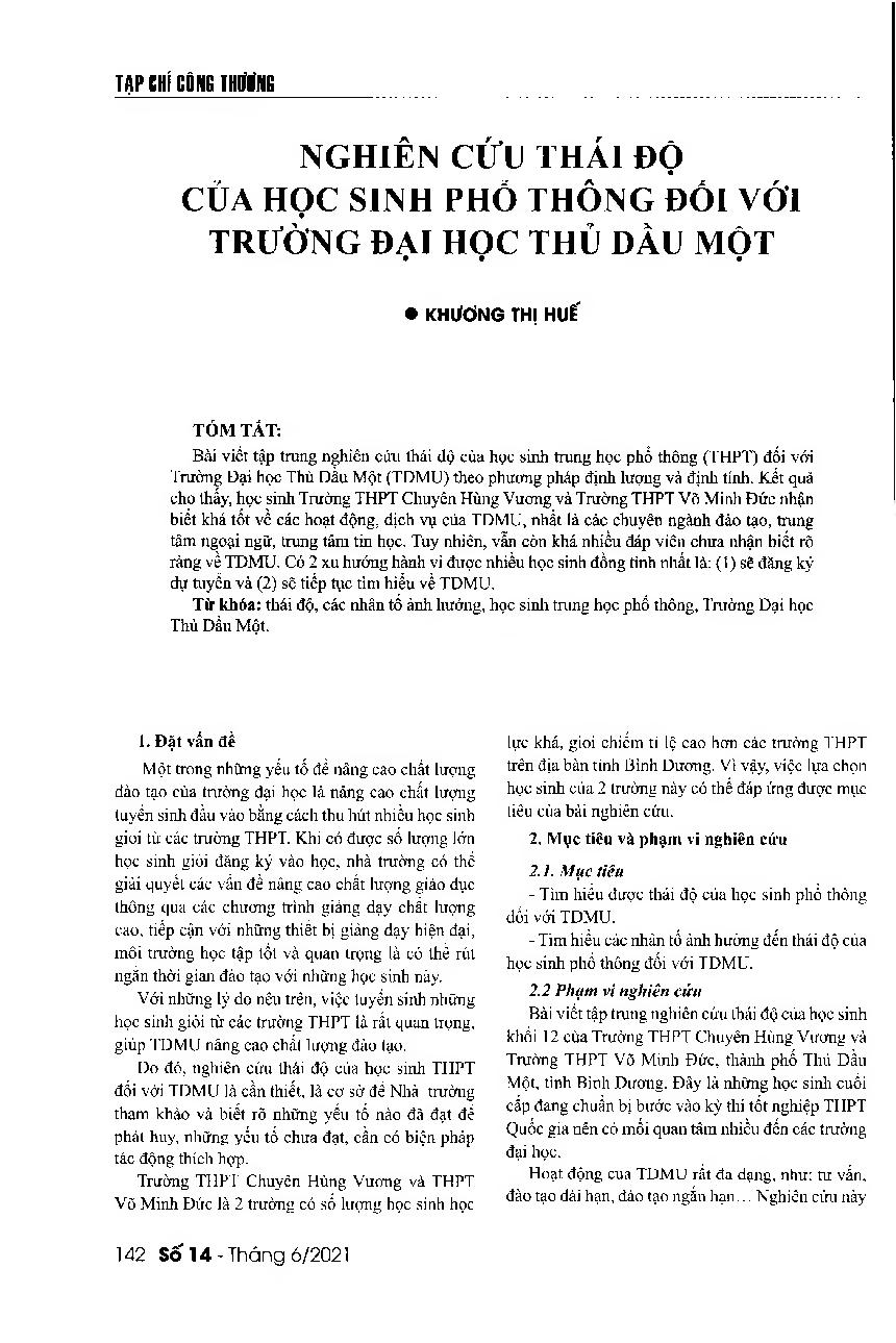 Nghiên cứu thái độ của học sinh phổ thông đối với Trường Đại học Thủ Dầu Một = A study on the attitudes of high school students towards Thu Dau Mot University