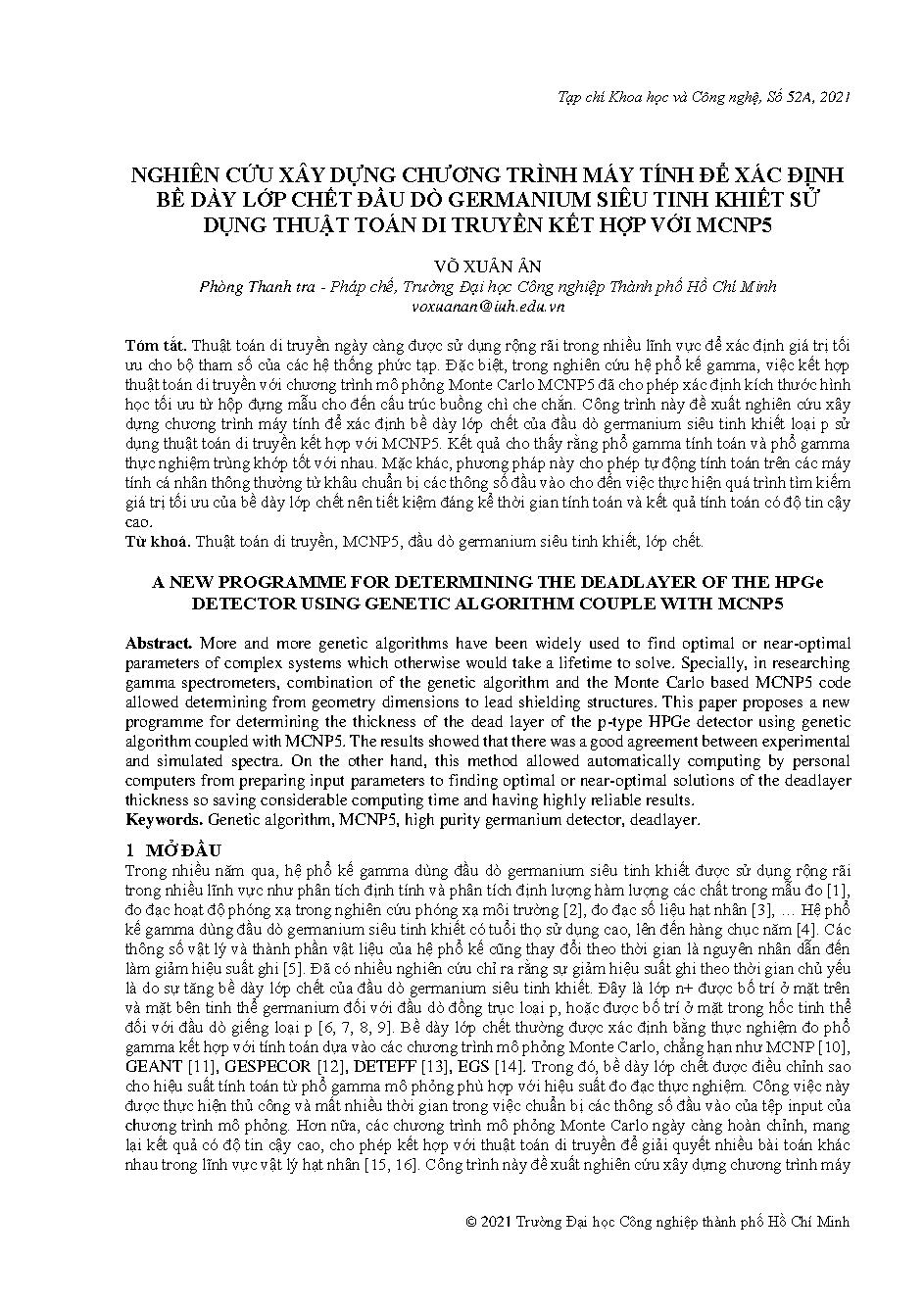Nghiên cứu xây dựng chương trình máy tính để xác định bề dày lớp chết đầu dò germanium siêu tinh khiết sử dụng thuật toán di truyền kết hợp với mcnp 5 = A new programme for determining the deadlayer of the hpge detector using genetic algorithm couple with mcnp5