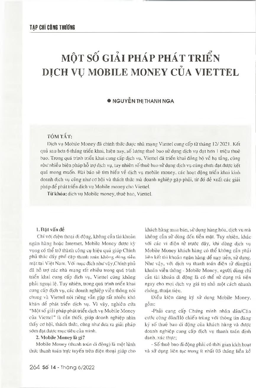 Một số giải pháp phát triển dịch vụ Mobile Money của Viettel = Some solutions to develop mobile money services of Viettel