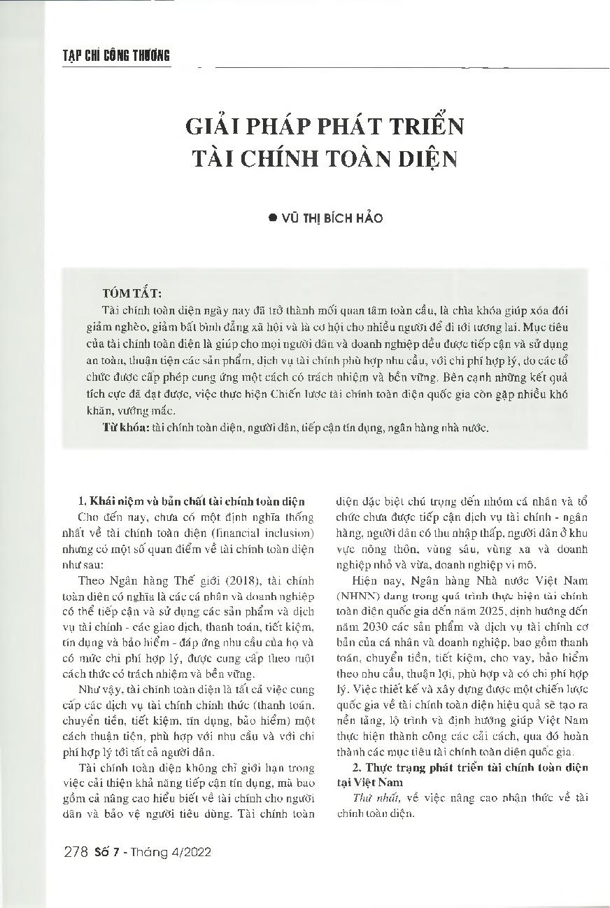 Giải pháp phát triển tài chính toàn diện = Solutions for the development of financial inclusion in Vietnam