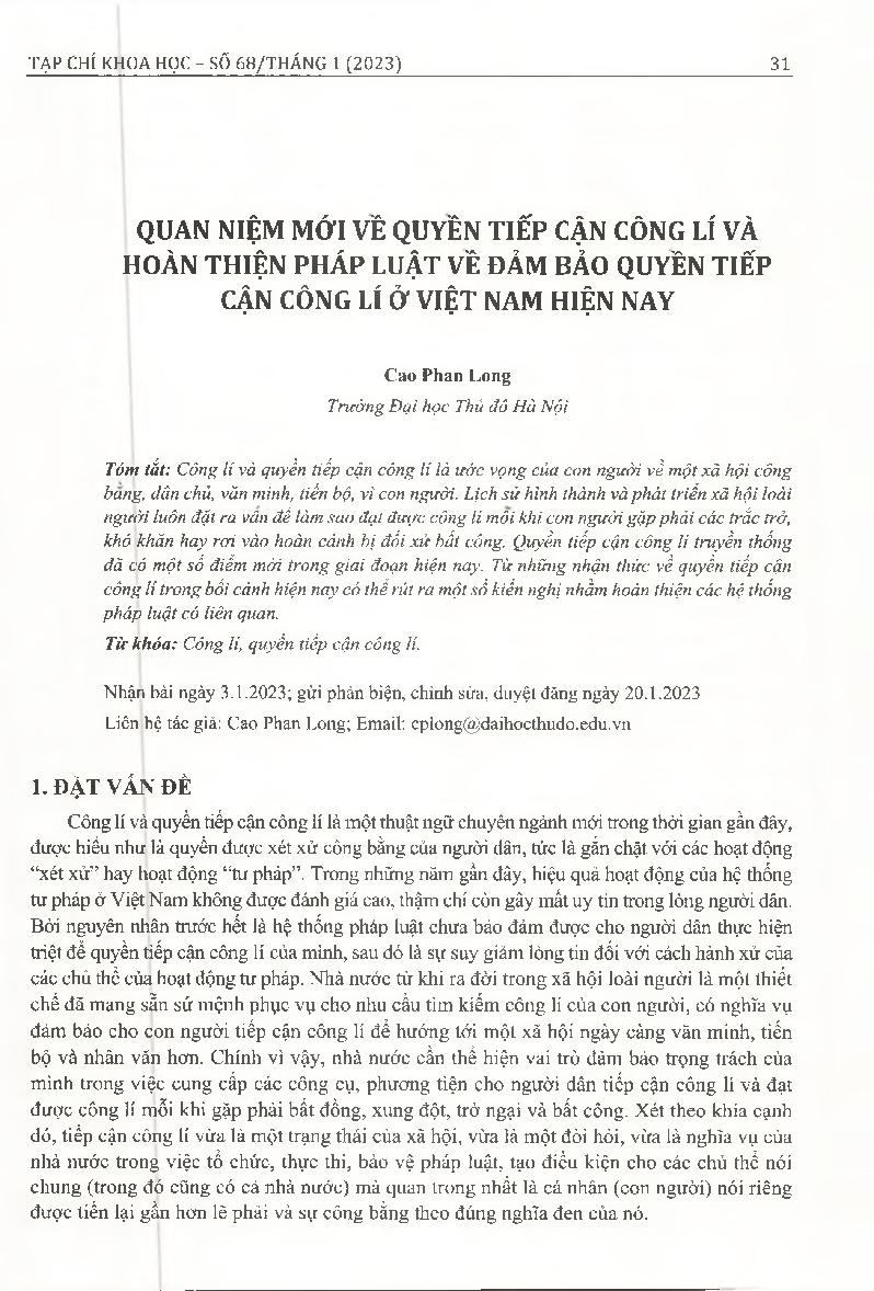 Quan niệm mới về quyền tiếp cận công lí và hoàn thiện pháp luật về đảm bảo quyền tiếp cận công lí ở Việt Nam hiện nay = New conception on access to justice and complete law on guaranteeing access to justice in Vietnam